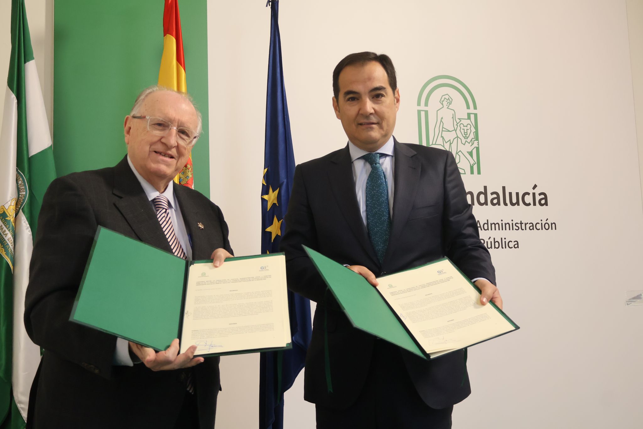 El consejero de Justicia, Administración Local y Función Pública, José Antonio Nieto, ha firmado un convenio de colaboración con el presidente del Consejo Andaluz de Colegios de Graduados Sociales, José Blas Fernández, para impulsar la mediación en conflictos laborales judicializados de la mano de estos profesionales especialistas en este ámbito del Derecho. Un documento “pionero” en nuestro país que va a permitir desarrollar una experiencia piloto en los juzgados de lo Social para aliviar de carga de trabajo a una de las jurisdicciones con más retrasos en la agenda de juicios y agilizar la resolución de los asuntos.