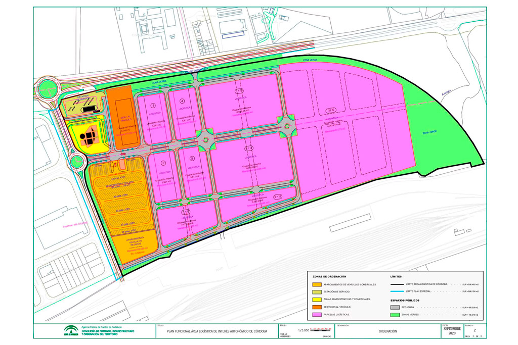 El desarrollo del Área Logística de Córdoba con 36 Ha. de superficie se ha previsto en 3 fases de 19, 13 y 4 hectáreas cada una y que se estructuran bajo la siguiente división funcional:
