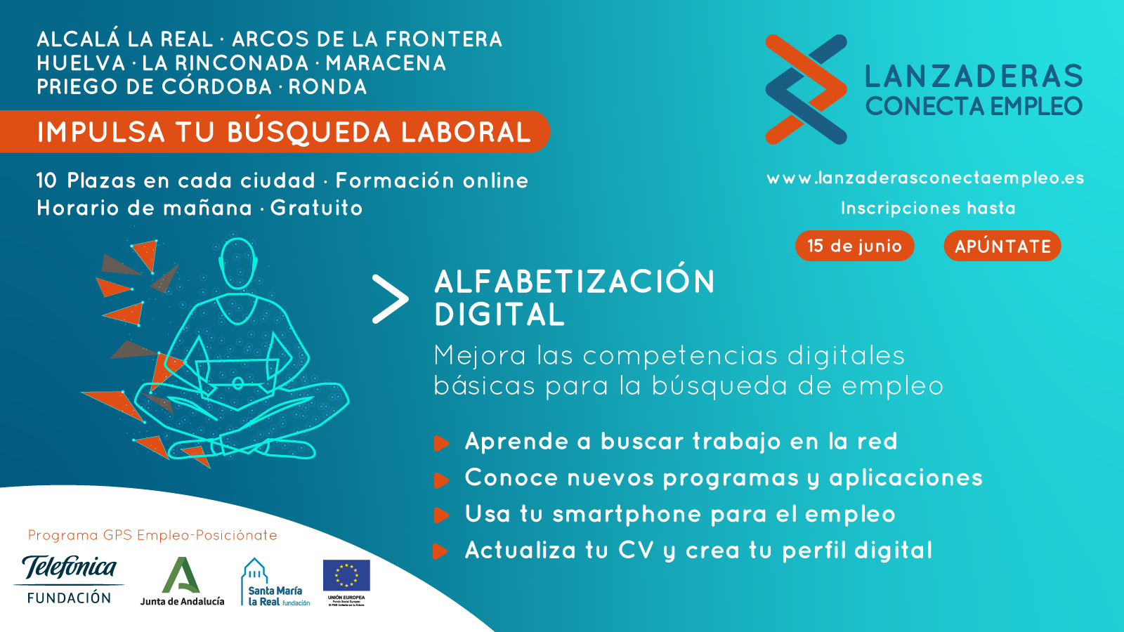 Siete ciudades andaluzas acogerán el próximo mes de junio la iniciativa de Alfabetización Digital para orientar a personas en desempleo a reforzar sus competencias digitales para la búsqueda de empleo. Los proyectos, impulsados por Fundación Santa María la Real y Fundación Telefónica, en colaboración con la Consejería de Empleo, Formación y Trabajo Autónomo, los ayuntamientos de las ciudades y la cofinanciación del Fondo Social Europeo, se pondrán en marcha en 25 ciudades de todo el país.