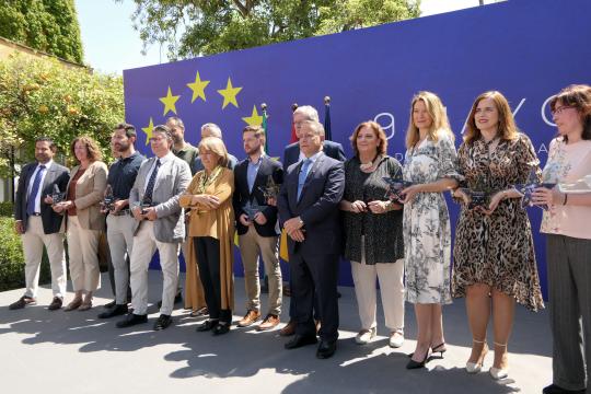 También con motivo del Día de Europa, el SAE ha estado presente en el acto organizado por la dirección general de Fondos Europeos de la Junta de Andalucía que se ha celebrado este lunes en el Monasterio Santa María de las Cuevas en Sevilla y en el que se han reconocido distintas iniciativas y buenas prácticas o proyectos gestionados con los diferentes fondos europeos. Entre los galardonados ha estado la empresa MEDIA INTERACTIVA SOLUTIONS S.L.U. que ha sido reconocida por el aprovechamiento de estos fondos en la creación y consolidación de empleo, a través del programa “Bono Empleo” gestionado por el Servicio Andaluz de Empleo. La directora general de Políticas Activas de Empleo, Aurora Lazo, junto con el equipo técnico del programa, ha acompañado a la empresa en el acto de entrega de las distinciones.
