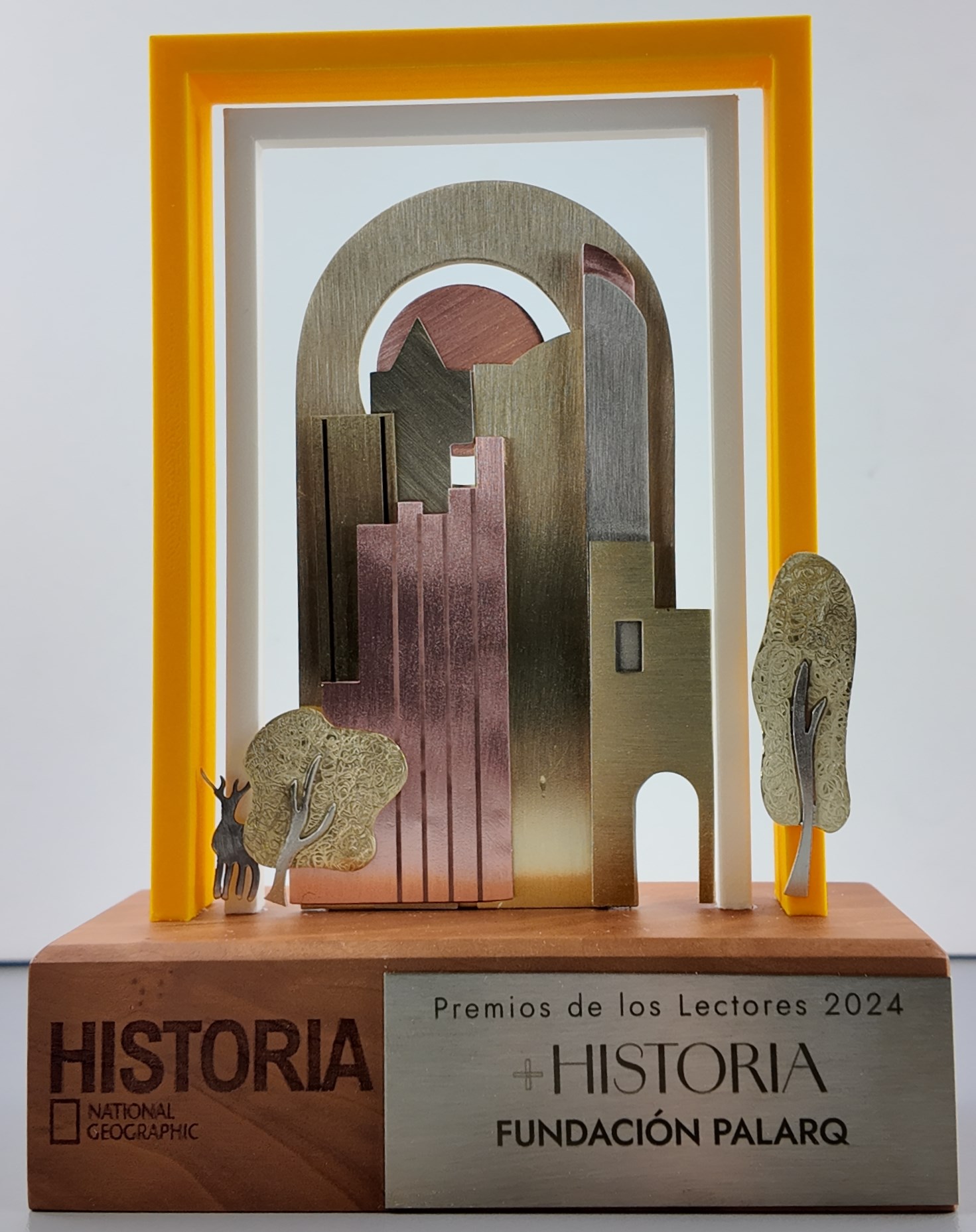 Y en esos objetivos se ha basado el diseño de la Escuela, combinando elementos arquitectónicos, naturales y culturales enmarcados por el icónico marco amarillo de National Geographic, generando una representación visual rica y simbólica para estos Premios +Historia.