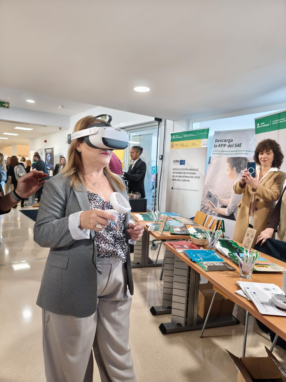 También, los asistentes a la feria han podido entrenar sus competencias para el empleo a través de un programa de gamificación en el ámbito de la orientación laboral haciendo uso de unas gafas de realidad virtual que pone a disposición el SAE, en las que se simulan diferentes dinámicas para el entrenamiento de competencias personales y enfrenta a las personas a situaciones que se encontrarán en su proceso de búsqueda de empleo como son la comunicación, el trabajo en equipo, la creatividad y el pensamiento crítico y la toma de decisiones.