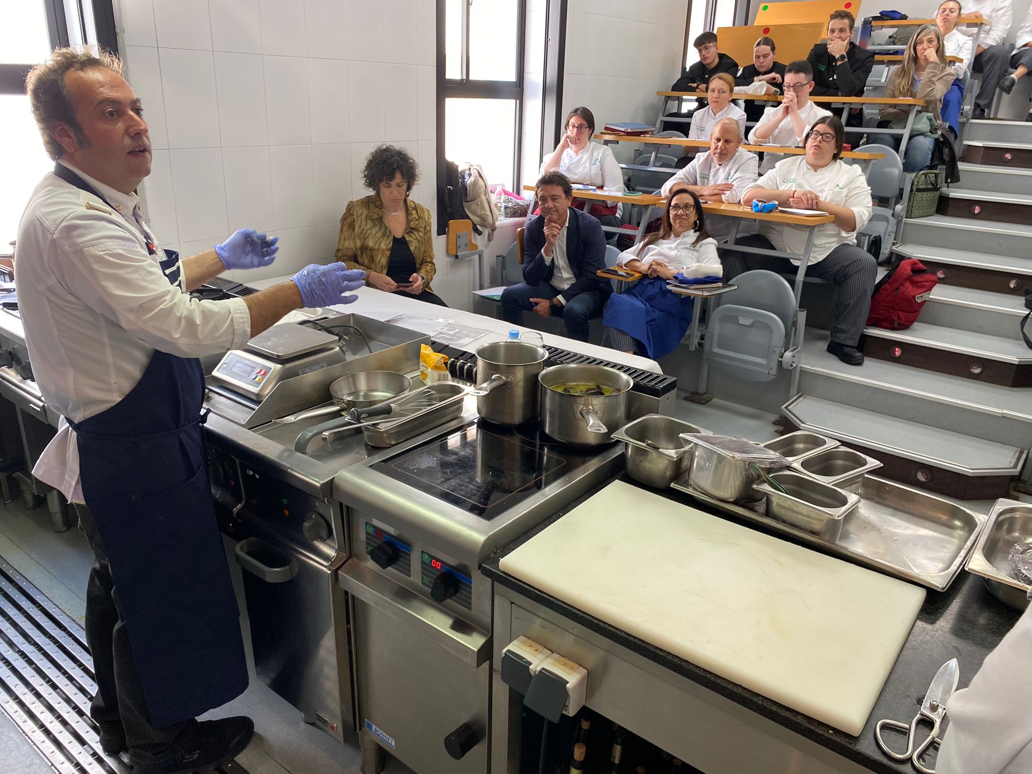 El chef invitado ha sido Cristian Rodríguez Sánchez, antiguo alumno de la propia Escuela y actual jefe de cocina del restaurante Alevante, distinguido con dos Estrellas Michelin y dos Soles Repsol. Rodríguez ha compartido con los asistentes su recorrido profesional, logros recientes, incluida la segunda estrella recibida en la gala Michelin celebrada en noviembre en Murcia, y su enfoque innovador centrado en la sostenibilidad y los productos del mar de kilómetro cero. Durante la jornada también ha desarrollado una demostración culinaria en directo basada en tres elaboraciones que representan su enfoque creativo, técnico y respetuoso con el producto.
