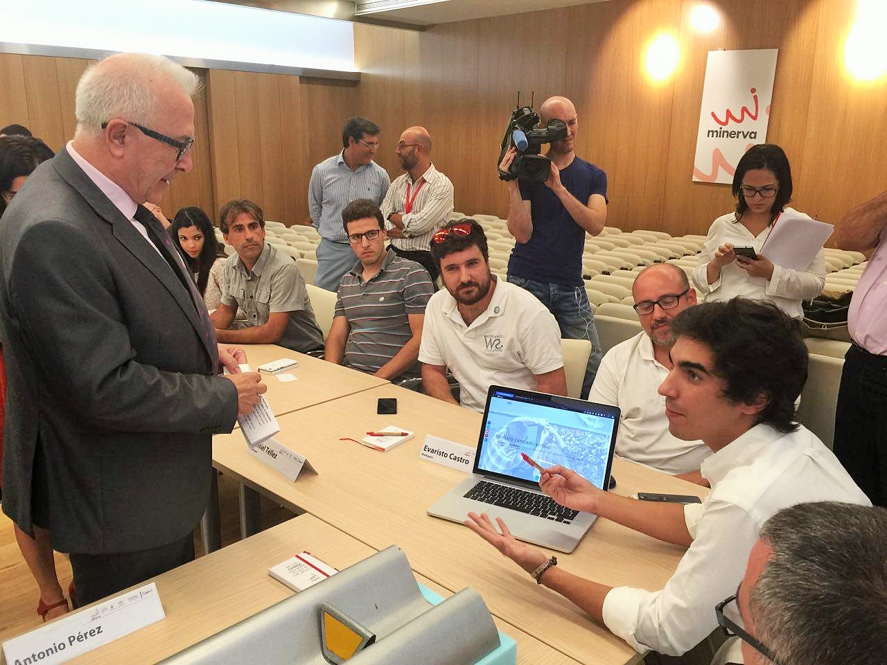 El consejero de Empleo, Empresa y Comercio, José Sánchez Maldonado, y el director territorial de Vodafone España en Andalucía, Antonio Fernández, han mantenido hoy en Sevilla un encuentro con los responsables de los 19 nuevos proyectos de emprendimiento tecnológico seleccionados en la última convocatoria del Programa Minerva. Este Programa, fruto del convenio de colaboración firmado por la presidenta de la Junta y por el presidente de Vodafone en septiembre de 2014, fomenta y consolida iniciativas andaluzas de emprendimiento en el ámbito de las tecnologías de la información y las comunicaciones (TIC).