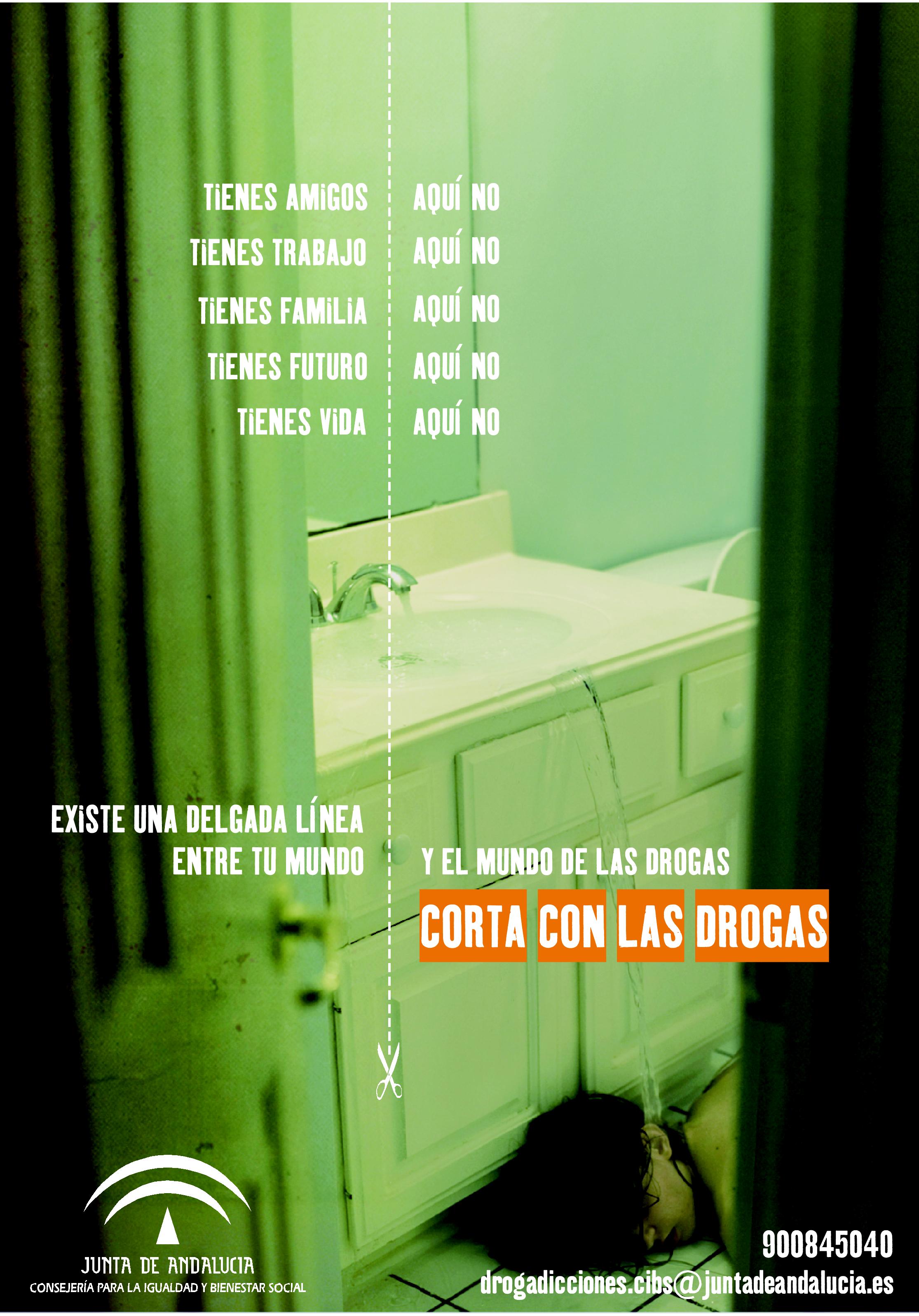 “Existe una delgada línea entre tu mundo y el mundo de las drogas. CORTA CON LAS DROGAS”.