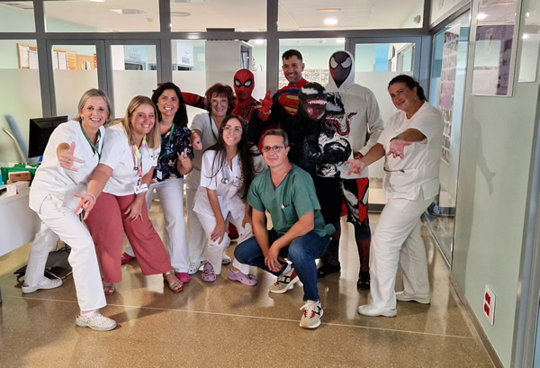 Spiderman, Spiderwoman, Lady Bug, Superman, Harley Quinn y Venom, encarnados por profesionales del hospital de diversas categorías, han compartido pupitre por unos minutos con los menores de hospitalización y posteriormente han recorrido las consultas externas y las urgencias pediátricas para cumplir una importante misión: dibujar una sonrisa en los niños y niñas que estaban hoy en el hospital.
