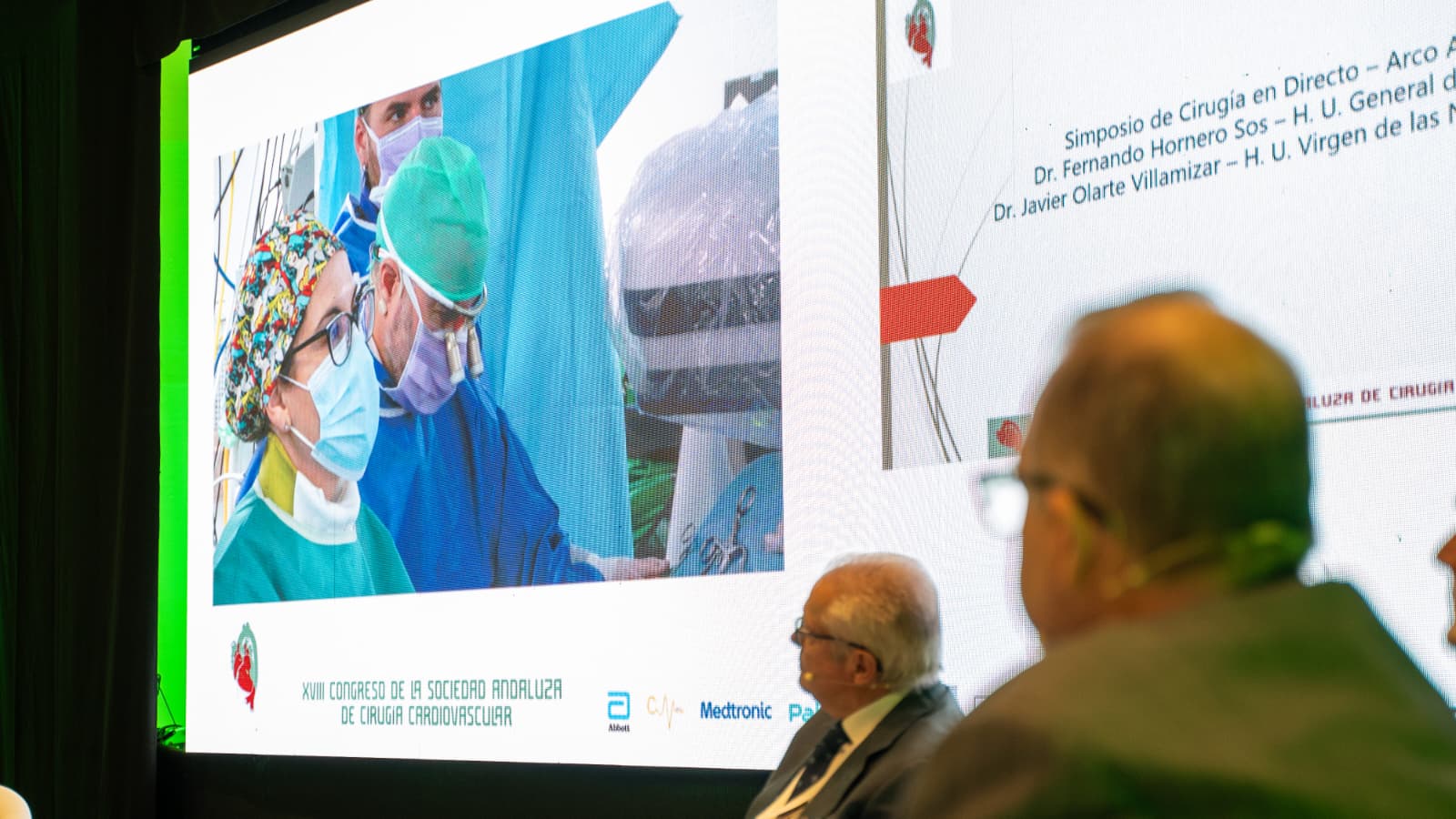 El Hospital Universitario Virgen de las Nieves ha efectuado dos intervenciones quirúrgicas que se han emitido en directo desde el quirófano híbrido del hospital granadino a la sede del 18 Congreso Andaluz de Cirugía Cardiovascular donde más de un centenar de especialistas de alto nivel han podido ver cómo el equipo de cirujanos llevaba a cabo procedimientos de alta complejidad en el abordaje de la aorta.