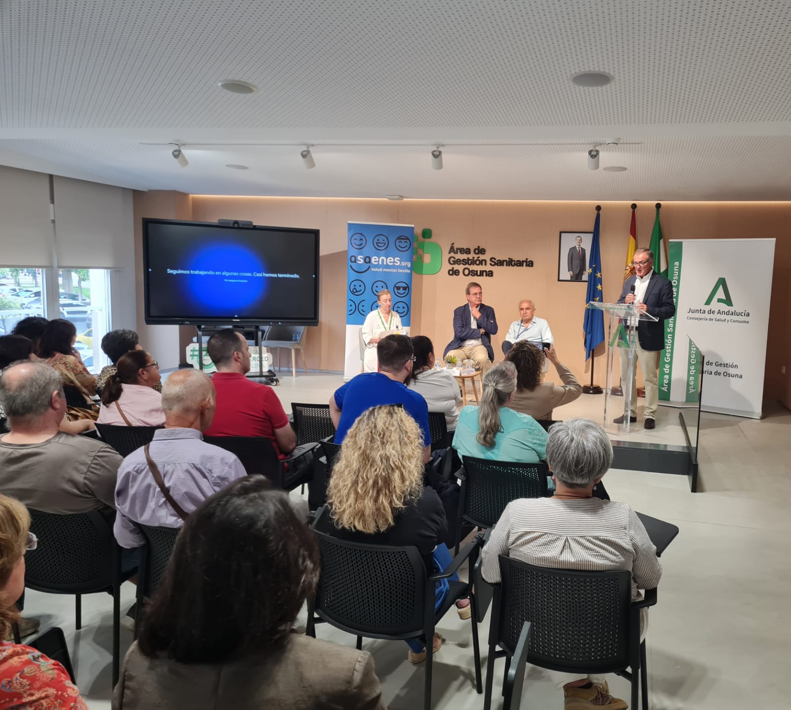El delegado territorial de Salud y Consumo, Manuel Molina, y la gerente del Área de Gestión Sanitaria de Osuna, Belén Lozano, han participado en el primer ‘Encuentro de Familias y Personas con Experiencia Propia en Salud Mental’ celebrado hoy en el Hospital Universitario de La Merced de Osuna. En el acto se ha firmado el convenio de colaboración entre la Unidad de Gestión Clínica de Salud Mental de Osuna y la Asociación ASAENES Salud Mental Sevilla. Sendos actos programados se circunscriben para conmemorar el Día Mundial de la Salud Mental.