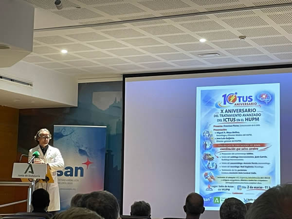 Con este motivo, el centro ha acogido hoy un acto de reconocimiento expreso al compromiso de todos los profesionales implicados: neurólogos, radiólogos intervencionistas, anestesiólogos, intensivistas, médicos de Urgencias, internistas, pediatras y especialistas en Rehabilitación. De manera especial, el agradecimiento se dirige al personal de Enfermería de la Unidad de Ictus y de Neurología, así como al de las distintas unidades colaboradoras, al personal auxiliar y a los celadores, “cuya labor es indispensable en la movilización y atención diaria de los pacientes;” y al personal administrativo, “que facilita la coordinación y gestión de un proceso asistencial complejo y urgente”, ha explicado Raúl Espinosa, neurólogo del Puerta del Mar y presidente de la Sociedad Andaluza de Neurología (SAN), con presencia en la jornada de hoy.