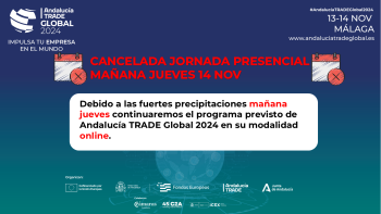 Andalucía TRADE GLOBAL 2024, el mayor encuentro de negocio del sector exterior que se celebra en la comunidad, ha decidido suspender también la jornada presencial de mañana jueves 14 de noviembre para celebrarla en formato online en su plataforma www.andaluciatradeglobal.es ante las recomendaciones de no realizar desplazamientos que no sean imprescindibles.