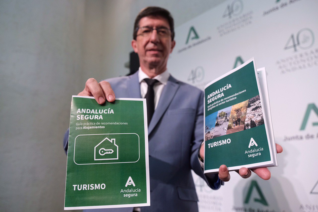 El vicepresidente de la Junta de Andalucía y consejero de Turismo, Regeneración, Justicia y Administración Local, Juan Marín, ha informado hoy de que el distintivo gratuito y voluntario ‘Andalucía Segura’ estará disponible a partir del próximo lunes para todas las empresas turísticas que estén interesadas y que ya estén inscritas en el Registro Turístico de Actividades. “Es un valor añadido a nuestras empresas y un reconocimiento a su profesionalidad y a su capacidad para adaptarse a estas nuevas circunstancias”.