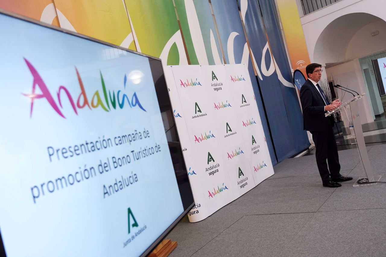 El vicepresidente de la Junta de Andalucía y consejero de Turismo, Regeneración, Justicia y Administración Local, Juan Marín, ha presentado esta mañana en Málaga el Bono Turístico Andaluz, que se pone en marcha hoy y hasta el próximo 31 de mayo, con un triple objetivo, “fomentar la movilidad turística en Andalucía, ayudar a las familias a que puedan viajar y sostener al sector turístico en un momento muy complicado”, ante estás circunstancias “el Gobierno andaluz tenía que estar ahí en apoyo de los profesionales”.