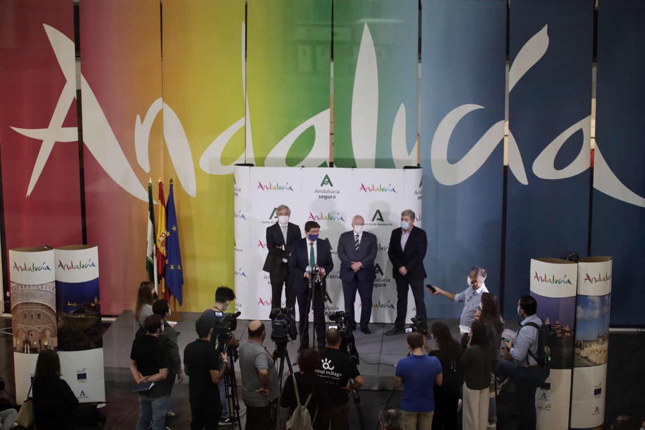 El vicepresidente de la Junta de Andalucía y consejero de Turismo, Regeneración, Justicia y Administración Local, Juan Marín, ha informado hoy en Málaga del acuerdo entre la Consejería de Turismo, la Confederación Española de Agencias de Viajes (CEAV) y la Unión de Agencias de Viajes (UNAV) para reforzar y reactivar el sector turístico en la comunidad. En el acto han estado presentes el presidente de CEAV, Carlos Garrido, y el de UNAV, José Luis Méndez. Una reunión en la que ha anunciado la posibilidad de ampliar el Bono Turístico Andaluz con acuerdos con otras comunidades autónomas y países vecinos.