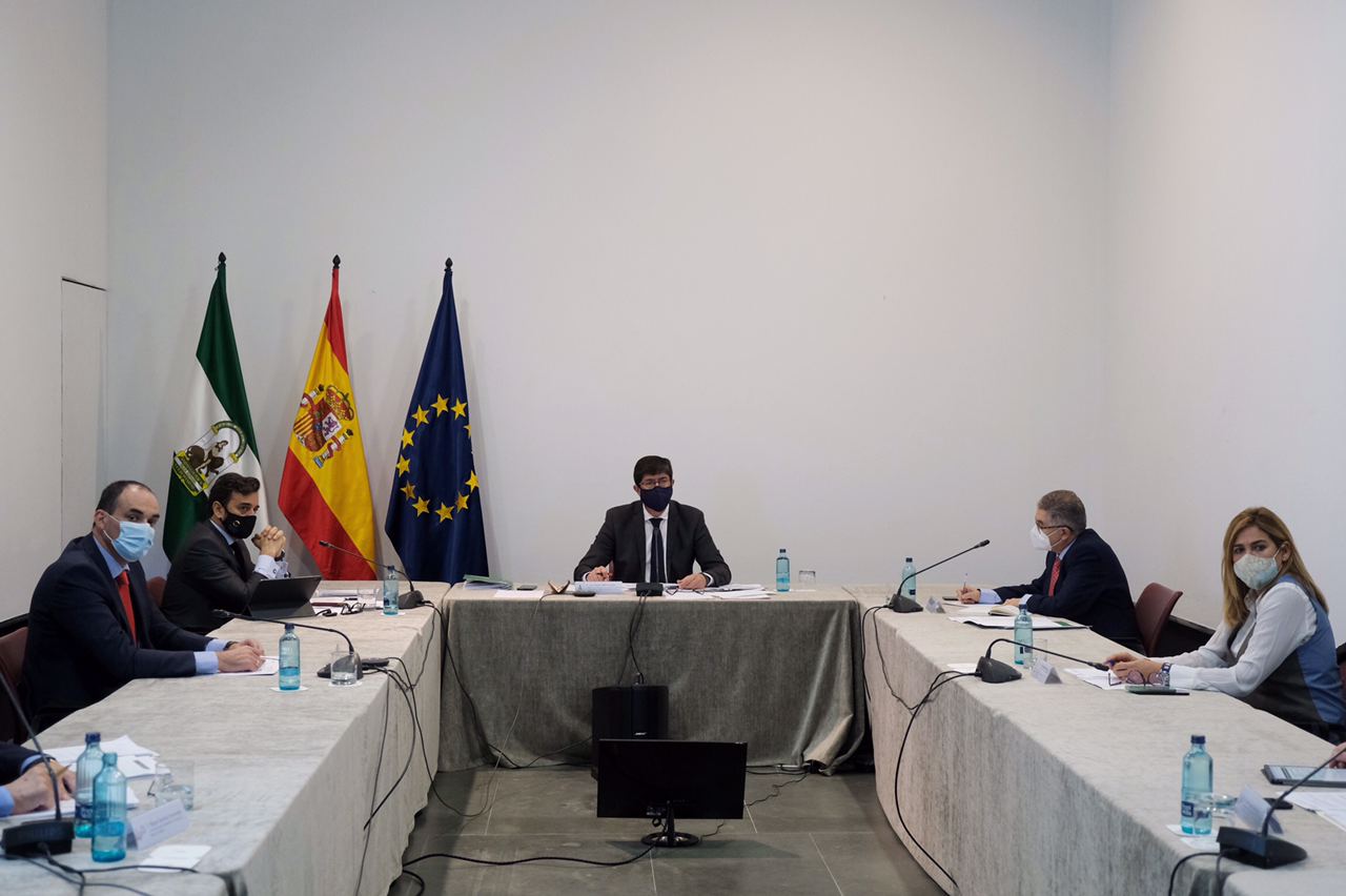 El vicepresidente de la Junta de Andalucía y consejero de Turismo, Regeneración, Justicia y Administración Local, Juan Marín, ha presidido esta mañana la reunión de la Mesa del Turismo de Andalucía, en la que ha detallado el plan aprobado el pasado martes por el Consejo de Gobierno en el que se da apoyo a empresas y autónomos.