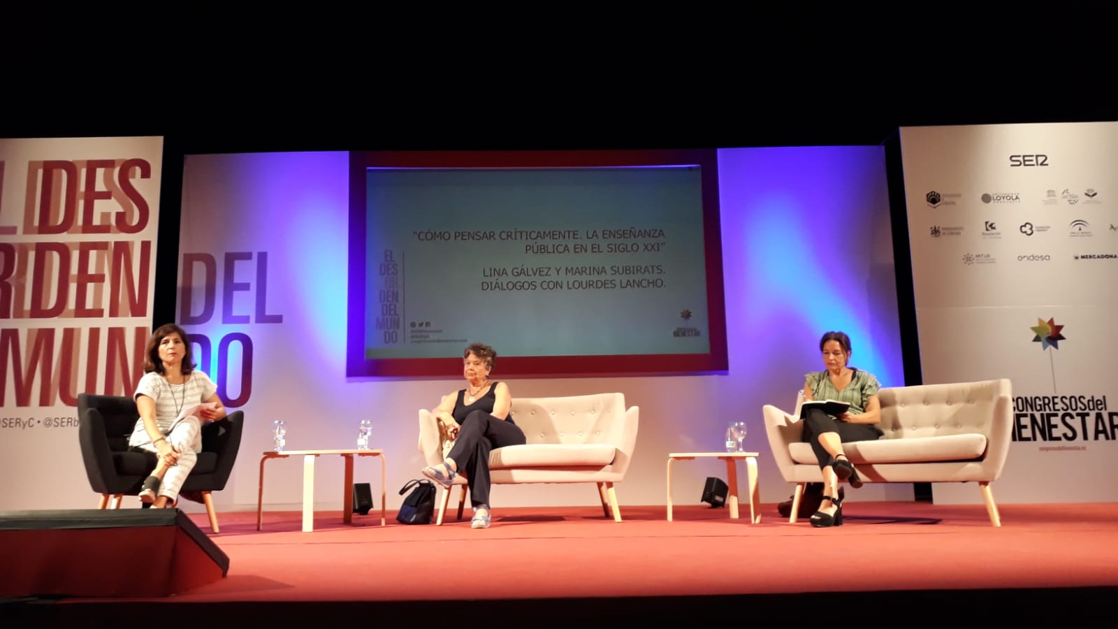 La periodista de la Cadena SER Lourdes Lancho ha conducido este debate y ha hecho referencia a esos “grandes problemas que se resuelven con soluciones baratas, derivando en el fascismo”. Marina Subirats señala la deshumanización de la enseñanza, enfocada a los resultados o hacia una ciudadanía más crítica.