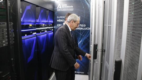 La Consejería de Transformación Económica, Industria, Conocimiento y Universidades ya ha culminado la instalación del nuevo supercomputador ‘Hércules’, de gran potencia y alto rendimiento que dará soporte en sus investigaciones a las universidades públicas y centros de I+D radicados en la comunidad. Su capacidad para el cálculo numérico, pudiendo realizar en un día operaciones que requerirían más de dos décadas, lo sitúa entre los cinco mejores de España en el ámbito académico y de investigación. Así se ha puesto de manifiesto durante la presentación de esta máquina, en cuya adquisición la Junta de Andalucía ha invertido casi tres millones de euros, tal y como ha destacado el consejero Rogelio Velasco, quien ha subrayado que esta infraestructura constituye un paso más en el refuerzo e impulso de la Junta a la I+D andaluza.
