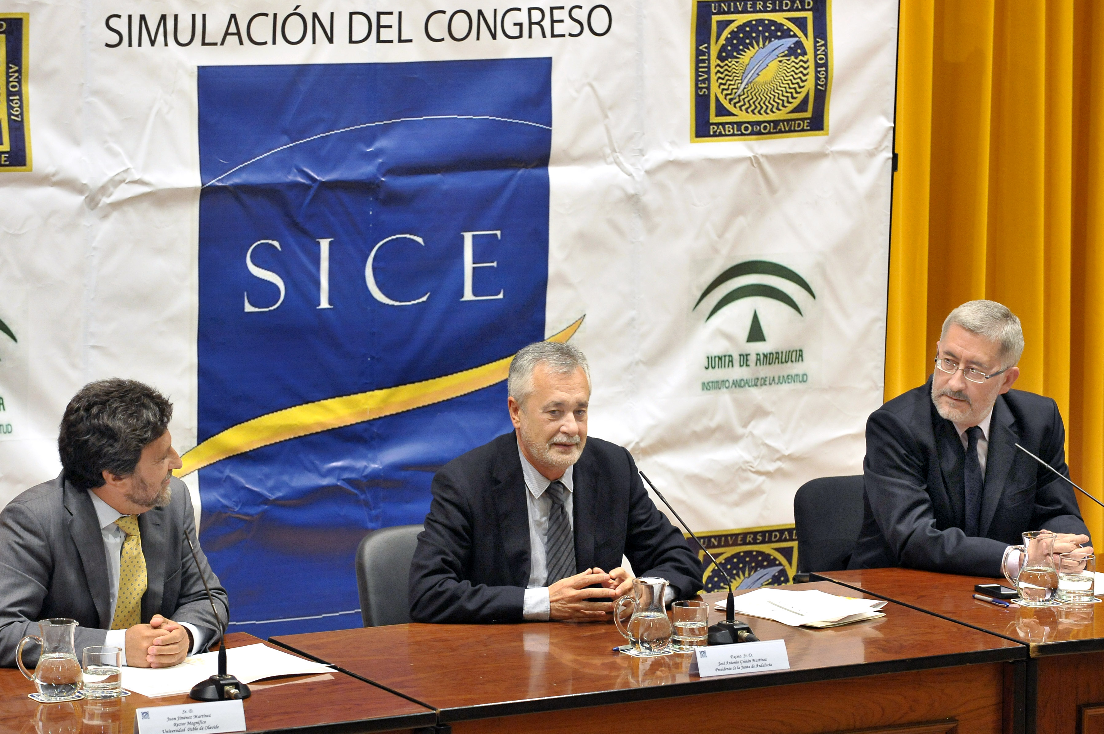 El presidente de la Junta, José Antonio Griñán, ha participado, junto con el consejero de Economía, Innovación y Ciencia, Antonio Ávila, en las jornadas de Simulación del Congreso Español SICE 2012, que se celebran por cuarto año en la Universidad Pablo de Olavide y reúnen a unos 150 estudiantes universitarios de toda España. La celebración del SICE 2012 permite que, durante una semana, los jóvenes tengan la posibilidad de conocer de primera mano el funcionamiento del Congreso de los Diputados español para así tomar conciencia de la labor de esta institución. Además, la iniciativa persigue fomentar la participación ciudadana para actuar y cambiar la realidad desde el diálogo y el intercambio de ideas.