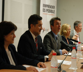 El rector de la UCA, Eduardo González Mazo, y la presidenta del Consejo Social de la Universidad de Cádiz, Ana Alonso, junto al secretario General de Economía de la Junta de Andalucía, Gaspar Llanes, la directora técnica GEM España, Alicia Coduras, y el director del GEM Andalucía, José Ruiz, han presidido hoy el acto de presentación de los principales resultados del proyecto GEM Andalucía 2012 en la Universidad de Cádiz.